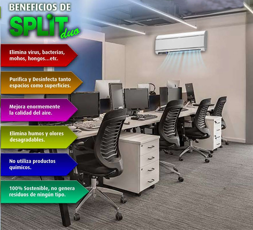 Preocúpate del aire que respira tu familia, confía en nuestros purificadores de Aire. Elegante Split mural con doble función: Se presenta en varios acabados, sencillo, con sensor de presencia o con un completo programador semanal, para llevar un perfecto control de la purificación y desinfección de la estancia. Split Duo El Split Duo utiliza la tecnologla más avanzada de Lámparas Ultravioleta UV-C para eliminar virus, bacterias y otros microorganismos. La Luz Ultravioleta ataca directamente el ADN de estos organismos, destruyéndolos o evitando que puedan reproducirse. Este tipo de desinfección es la ideal para su uso en nuestro día a día, ya que no es perjudicial para nuestra salud y se puede utilizar para purificar el aire de infinidad de espacios como oficinas, aulas, salas de reuniones, salas de espera, locales comerciales, bares y restaurantes … etc. Producción ozono: 2 g/h Aire puro y desinfectado al 100%